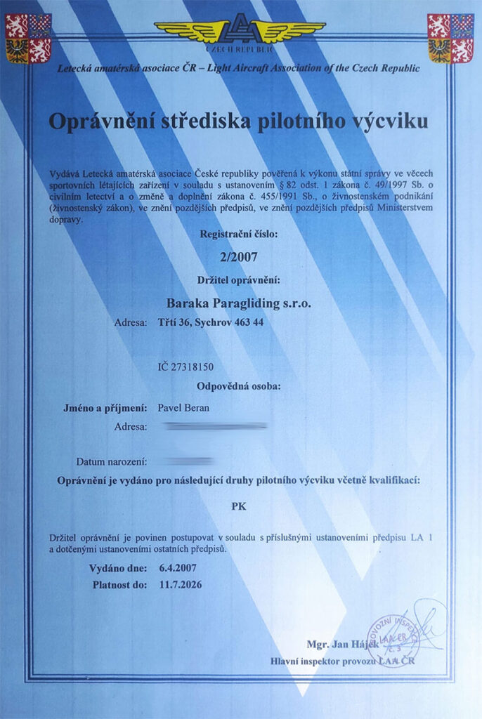 Založil ji zkušený letecký inspektor Pavel Horáček, jeden z průkopníků paraglidingu v Čechách. V současnosti škola pracuje pod vedením inspektora Pavla Berana. Rádi Vám poskytneme nejen veškeré teoretické a praktické znalosti, které jsou pro Vaše budoucí bezpečné létání nezbytné, ale také spoustu rad a zkušeností, nasbíraných naší více jak 25letou praxí.